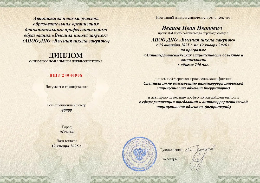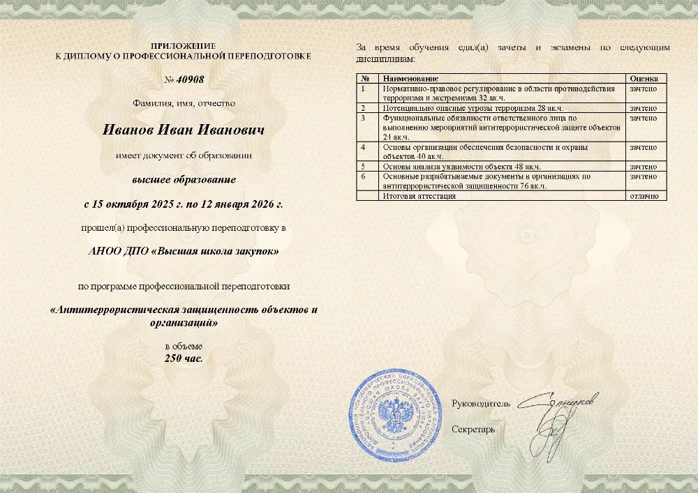 Повышение квалификации, 72 академических часов, 7 модулей: нормативно-правовые основы противодействия терроризму, анализ угроз и рисков, функциональные обязанности ответственных, инженерно-техническая укрепленность, документооборот и действия персонала при ЧС. Онлайн-обучение в в Санкт-Петербурге с итоговой аттестацией.