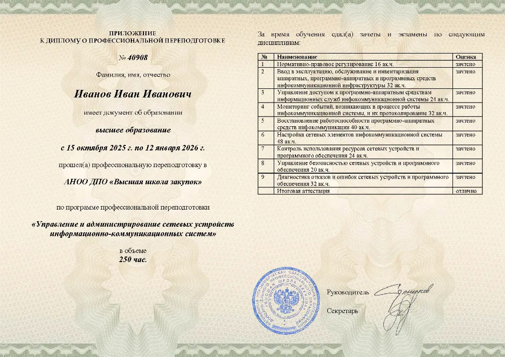 Профессиональная переподготовка, 250 академических часов, 9 модулей: нормативно-правовое регулирование и ввод в эксплуатацию, настройка и мониторинг сетевых устройств, управление доступом и безопасностью, диагностика и восстановление работоспособности инфокоммуникационных систем. Онлайн-обучение в в Санкт-Петербурге с итоговой аттестацией.