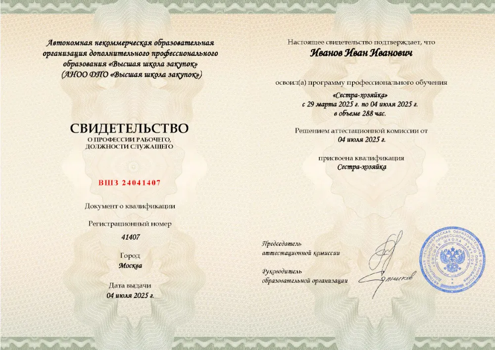 Программа профессиональной подготовки (288 часов) для сестёр-хозяек. Освойте организацию санитарно-гигиенического режима, хозяйственную деятельность в ЛПУ, основы эпидемиологии, деонтологию, оказание первой помощи и профессиональные обязанности. Онлайн-обучение в в Санкт-Петербурге с итоговой аттестацией.